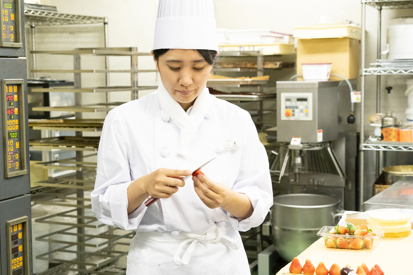 東京ベイ舞浜ホテル ファーストリゾート 勤務 /パティシエ科/2016年3月卒/学校の授業の一環として、さまざまな企業との出会いの場があり、そこで現在の職場の担当者に声をかけてもらったという。シェフの話に感銘を受け、東京ベイ舞浜ホテル ファーストリゾートの入社試験を受け、見事合格。「パティシエの仕事は一見華やかに見えて、実は体力勝負の側面も。でも学生時代に体力に自信がなくても大丈夫。仕事をするうちに自然と体力がつくので、お菓子が好き、お菓子を作ってみたいという気持ちがあれば、ぜひチャレンジしてみてください!」(東さん)。
