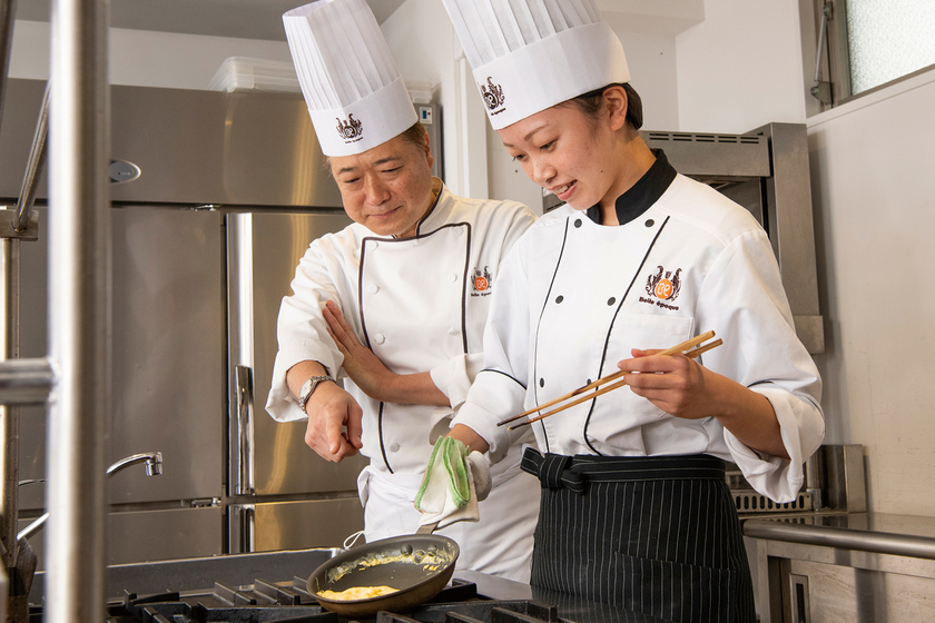 指導において飯田先生が大切にしているのは、「失敗してもいいんだよ」と伝え、挑戦する姿勢を大切にすることです。なかなかうまくできないときは、先生が見本を見せながら「どうして失敗したのか」を細かくアドバイスしていきます。スキルアップを実感できる学内コンテストの機会もあり、1年次は、例年オムレツのコンテストを開催。2年次の卒業制作では、業界の一線で活躍するシェフらを招いて試食会を実施。学生たちには試食したトップシェフからの評価が伝えられ、大きな学びと成長を実感できる貴重な体験となっています。