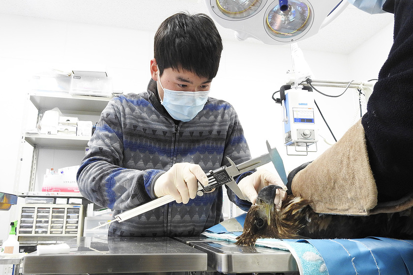 猛禽類医学研究所では主にオオワシやシマフクロウなど絶滅危惧種である猛禽類の救護から野生復帰までを仕事として環境省から請け負っています。私は研究員として獣医師が行う治療の補助をするとともに、リハビリテータ―として治療した個体の世話、飛翔や採餌の訓練を行っています。また、フィールドにて人間と野生動物が共存できるよう、環境調査や対策の立案をする業務もあります。事故や病気で収容された鳥たちが野生復帰できた時、そして野生に帰った後、個体に装着したGPS送信機のデータなどから、きちんと生きていることを確認できた時が喜びです。野外調査の結果がミティゲーションや事故対策に生かされている時もやりがいを感じます。