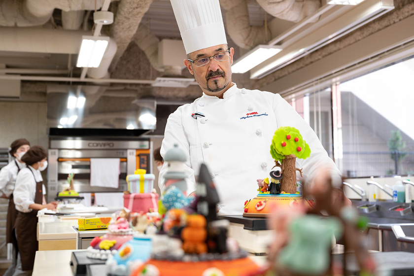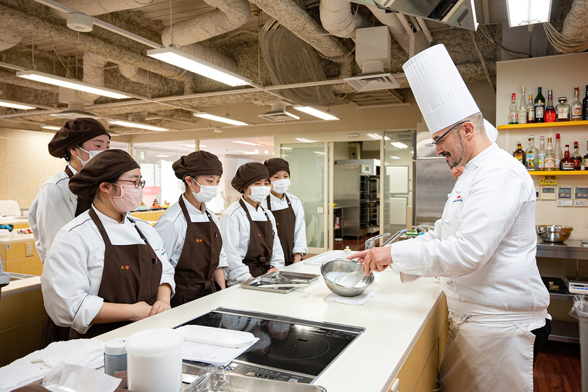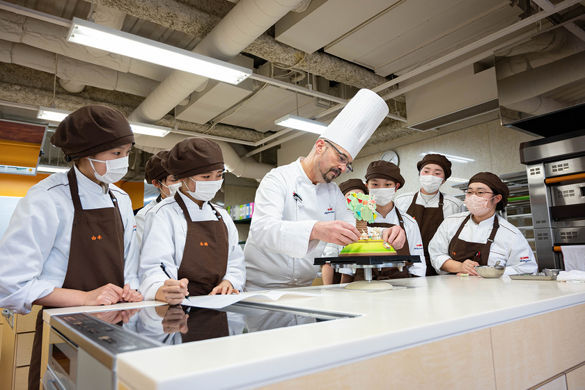 ケーキを見て「きれい!」と喜んでもらえたり、食べて「美味しい!」と目を輝かせてもらえたり、パティシエは素晴らしい仕事です。たくさんの人の幸せそうな顔を見られるなんて、これ以上の喜びはありません。学生が学校生活の中で職人としてのスタートラインに立てるよう、情熱と愛情をもって指導しています。将来、現場に出たときに役立つように、技術の習得だけでなく衛生面やマナーなどもしっかり学べます。ぜひ自分の特技を伸ばし、やりたい仕事、誇りをもって出来る仕事を見つけ、それに向かって努力してほしいです。また、本場のフランス語を交えながら授業を行うので、自然とフランス語が身につきます。日本語訳がなくても理解できるようになれば、現場での強みになりますよ!