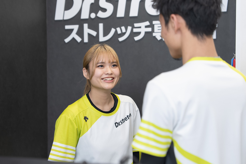 入社後すぐに研修所でストレッチの技術や接客マナーを学びました。企業理念「人の未来を大きくする」に触れ、自分の目標とも重なることでさらにやる気がアップ。Dr.stretchの店舗では、お客様のカルテづくりから始めます。体に触れながら痛みや希望を聞いてストレッチを開始。ストレッチの後、多くのお客様が体の軽さや動きやすさを実感し、喜んでくださいます。お客様は20代から70代まで幅広く、特に50代の方が多いですね。ストレッチ中の会話を通して私自身も成長でき、今では30名以上から指名をいただけるようになりました。将来はアスリートに帯同するトレーナーになりたいと思っており、社内の専門部署でその夢を叶えたいです。