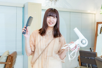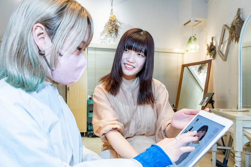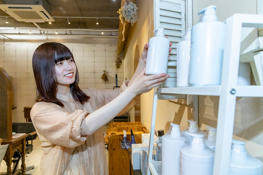 「ありがとう」「シャンプーがすごく気持ちよかったです」とお客様に言っていただくことが何より嬉しいです。今は1年目なので、アシスタントとしてスタイリストの先輩たちのサポートをすることが多いのですが、先を読んで準備をしたりすると、先輩方も「ありがとう」「助かったよ」などと声をかけてくれます。こうした一言で、自分が誰かの役に立っていることが実感できると「もっと頑張ろう!」と仕事への意欲もわいてきます。まだ勉強の毎日ですが、将来はスタイリストとしてだけでなく、着付けやヘアセットなど、オールマイティにこなせる美容師になりたいです。