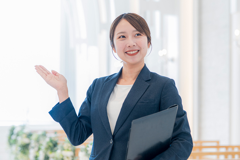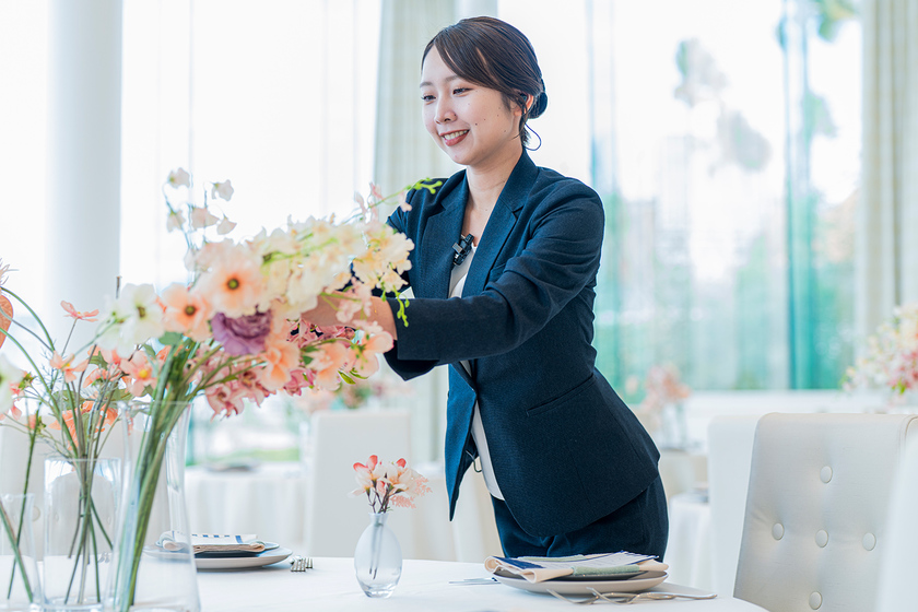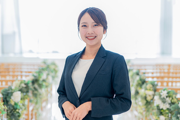ブライダルフェアにお越しのカップルに私たちの結婚式についてご案内し、プランニングからプロデュース、当日のアテンドやサポートまで、トータルプロデュースの仕事をしています。この仕事の魅力は「人生のオールスターが集まる一日」のお手伝いができることです。結婚式は新郎新婦様や、ご家族などまわりの方々にとっても、人生をより豊かにするもの、お一人おひとりの未来にまで残るものだと思っています。そんな瞬間を作り上げられることにやりがいを感じずにはいられません。お客様の想いを何十倍、何百倍にも膨らませることがプロであり、「最高の結婚式でした」と心から喜んでいただくことが私の使命です。