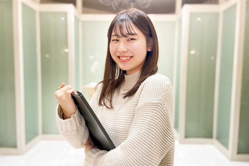 高校での企業説明会でブライダル業界を知り、ドレススタイリストという仕事があるんだと知って目指すようになりました。将来は、女性にとって夢のウェディングドレスを提案したいです! 今は、SNSで毎日ドレスを見てデザインやブランドをチェックしながら、自分の理想のドレスを選ぶための参考にしています。