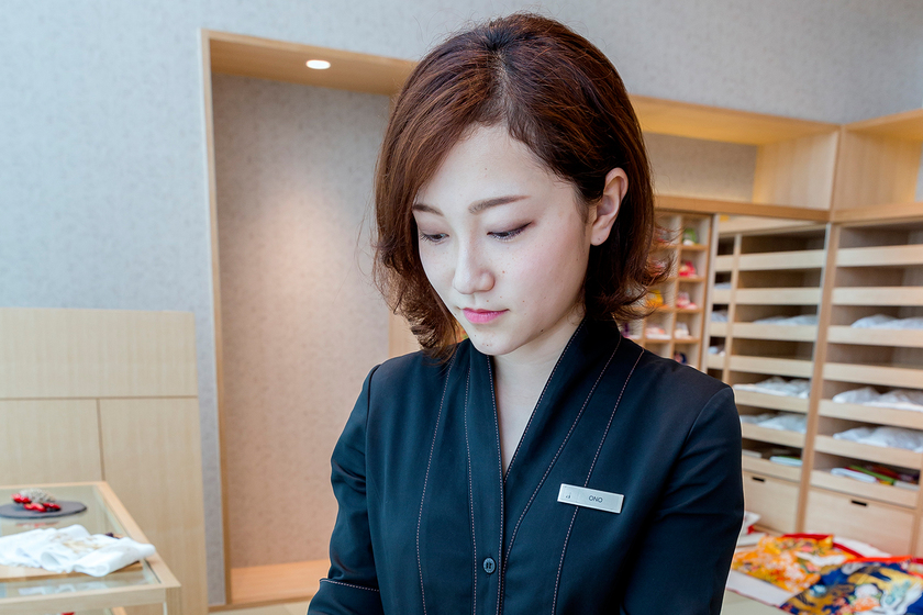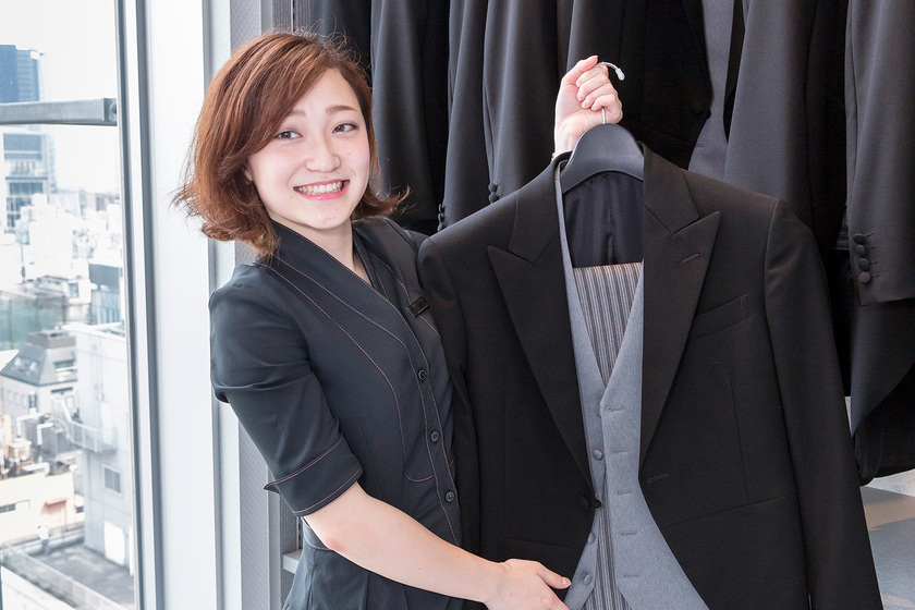 今はスタイリストアシスタントとして、着付けの手伝いやドレスの移動、新郎様の接客を担当しています。それぞれの業務は、社内テストに合格後、1人で担当することができるようになります。テストは、上司が実践的なスキルをチェックするというものです。新郎様のタキシードのテストはすでに合格したので、次の目標はアシスタントを卒業して、スタイリストデビューすること。秋にはスタイリストとしてひとりで新婦様を担当できるようなりたいです。そのために、今は仕事の空き時間を使って、新婦様にわかりやすくドレスの説明ができるようにその特徴を覚えたり、きれいにヘアセットや着付けができるように練習したりする毎日です。