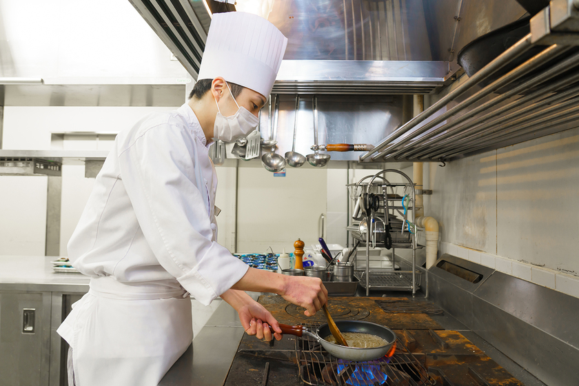 ホテルモントレ グラスミア大阪 調理部 宴会調理課 勤務/調理師科 卒/2013年卒/飲食関連のアルバイトが、調理のプロを目指すきっかけになったMさん。おいしいのはもちろん、安心・安全な料理作りを心掛けている。「ecole UMEDAでは和食と中華料理、フレンチを学ぶことができました。それぞれ特色がありますが、和食と中華料理はイメージしやすいもの。一方、フレンチは知らないことが多く、実習が毎回楽しみだったんです。このドキドキワクワクをプロになっても味わいたい、お客様にも提供したいと考えてフレンチの道を選びました」。