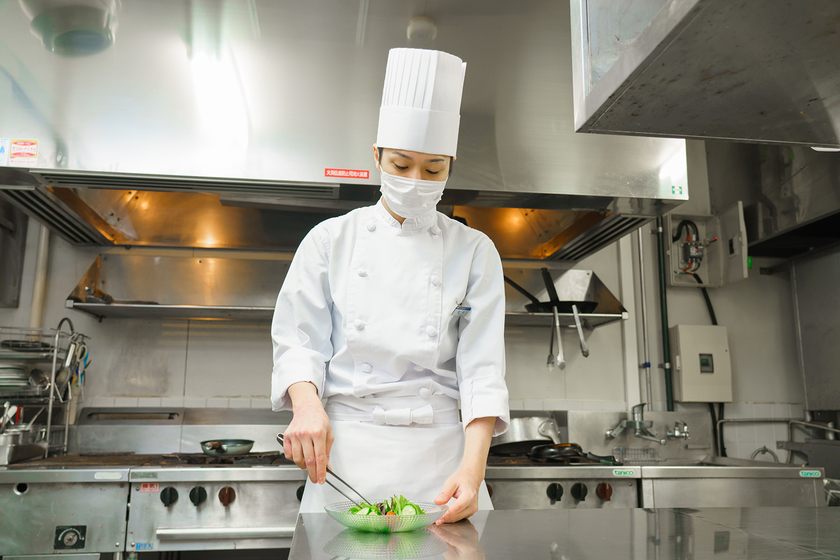 火やガス、刃物などを取り扱う調理場では厳格なルールが大切です。ecole UMEDAでは挨拶や時間厳守などのマナー教育を徹底しており、おかげで入社後も戸惑うことはありませんでした。在学中の学びで印象に残っているのは、何といっても「毎日つくる実習」。実際に頭と手を動かすことで、調理の基本をしっかり身につけられました。「本番バンケットトレーニング」も思い出深い授業です。100人以上の大量調理を行うのですが、事前の準備や段取りの大切さを体験的に学び、スピードやチームワークを養えました。現在の配属先である宴会部門での業務にとても役立っています。今後の目標は、自分の考えたオリジナル料理を提供できるようになることです。