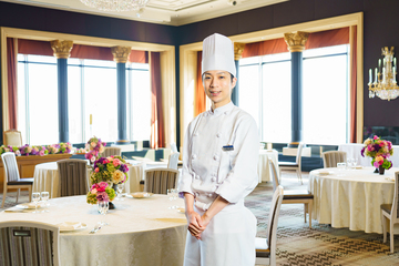 私がホテルモントレグループへの就職を希望したのは、お客様の層が幅広く、親しみやすい雰囲気が気に入ったから。なかでもグラスミア大阪はホテル内の独立型チャペルが人気で、ブライダルにもよく利用されています。人生のメモリアルイベントで召し上がっていただく料理をつくる仕事は責任が重い一方、それ以上に大きなやりがいを感じますね。フレンチの調理師として入社した私は、数年間レストランを担当。次に配属された鉄板焼きでは、お客様の目の前で行う調理作業をエンターテインメントとして考え、見ても食べてもご満足いただけるよう心掛けました。現在は宴会調理を担当しており、大量調理の難しさと面白さを実感しています。