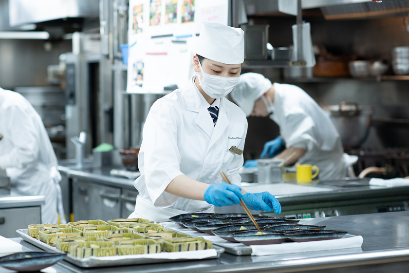 積極的に取り組むほど技術が身につき、成長を感じるのが調理の魅力。奥が深い京料理の調理師としての仕事にやりがいを感じています。ホテルオークラ京都の京料理「入舟」では、日本の四季や行事に合わせて食材はもちろん器や飾りつけにこだわり、料理による表現力を養うことが可能です。入社1年目は、フルーツ場で和菓子や漬物づくりの補助。2年目は八寸場、3年目は板場に。「今よりもっと難しいことに挑戦したい」と言い続け、意欲が認められて短期間で配置換えしていただけました。4年目には焼き物を担当し、ひと通り経験した5年目の現在は再び八寸場に。全体を見ながら、いま自分がすべきことを考えて調理できることに満足しています。