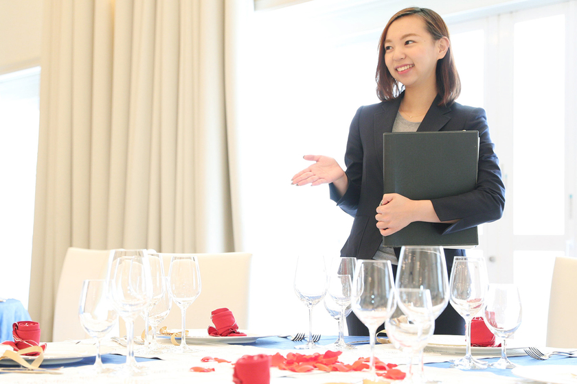 アール・ベル・アンジェ名古屋 勤務/ウエディングプランナー科 ハウスウエディングコース/2016年卒/一生に一度の記念日に携わる責任感と達成感に憧れて、プランナーを志す。名古屋ウエディング&ブライダル専門学校卒業後は、アール・ベル・アンジェ名古屋に就職。入社後の研修ではサービス部門での手伝いや先輩プランナーのアシスタントを経験し、6月にはプランナーとして独り立ち。学生時代に充実したインターンシップ制度で現場経験を積んだことが、就職した後も役立っている。入社2年目ながら後輩を育てる立場になった今、指導する楽しさを実感している。