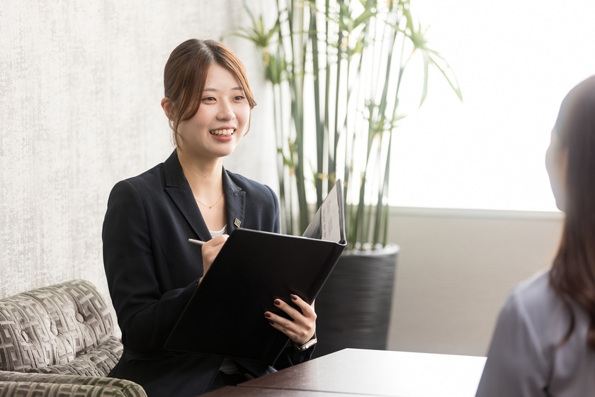 結婚式当日に向けての新郎新婦様とのお打ち合わせに加えて、最近初めて来館される新郎新婦様をお迎えするチームにもなりました。幅広く挑戦し、やりがいを感じる毎日です。結婚式本番に向けてのお打ち合わせでは、新郎・新婦様が結婚式をあげるにあたって何をしたいか、どういうことを大切にしたいかなどの要望をうかがい、当日を迎えるようにしています。お打ち合わせではお二人とも幸せいっぱいの表情で、そんなお二人のサポートをしていくのはとても楽しいです。私が提案したことに対して「それいいですね」「当日が楽しみです」と言ってもらえるのが今は一番うれしいですね。