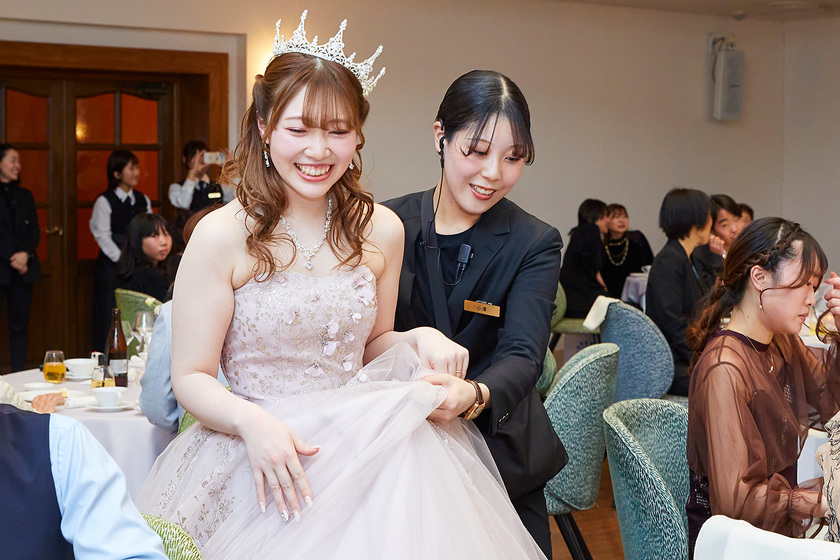 新郎新婦が思い描く結婚式を作り上げられるプロを目指します。ブライダルに関する専門知識とスキルを高め、感動の結婚式をプロデュースするウェディングプランナーを目指すのが「ウェディングプランナー科」です。1年次には、企画、演出、構成、音響、照明、接客などすべてを本番さながらのスタイルで実践する模擬挙式を行い、総合的なプロデュース力を身につけます。2年次には、2年間の集大成として、公募した新郎新婦の本物の結婚式をプロデュース。特別な日が最高のものとなるように、最初の打ち合わせから当日のアテンドまで、学生の力で創り上げます。