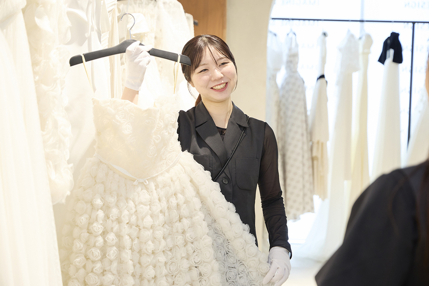 現在は、テイクアンドギヴ・ニーズが運営するDRESSMOREのドレスコーディネーターとして、新郎新婦様やご列席の方のお衣装提案を担当しています。DRESSMOREでは、衣装選びだけでなく補正やメンテナンスまで行い、挙式直前まで新婦様の体にぴったり合うよう丁寧に仕上げていきます。私はまだ新人で学ぶことばかりですが、初回のお打ち合わせで「次も富永さんにお願いしたいです」と言っていただけた時は、本当に嬉しく、もっと頑張ろうと思えました。これから多くのお客様と出会う中でも、初めてドレスに心を奪われた時の初心を忘れず、一着一着に想いを込めて向き合っていきたいです。