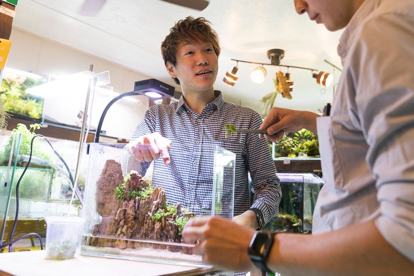 学校卒業後、有名アクアショップで働いた後、自分のショップ「AQUARIUM TALL MAN」をオープン。現在は、生体や水草の販売をはじめ、超大型水槽、コンパクトな水草水槽まで、お客様の色んなニーズに合った水槽の設置・レイアウト・メンテナンスサービスを提供しています。他にも、アクアリウムの魅力発信にも力を入れていて、YouTubeでは、私自身の人気もアップし、ファンがいるほど(笑)。自分の大好きなアクアリウムのお店を持って、お店の考えに共感する仲間が増え、そのお店を愛してくれるお客様が多くいらっしゃる。この喜びは、独立したからこそ味わえるものですね。