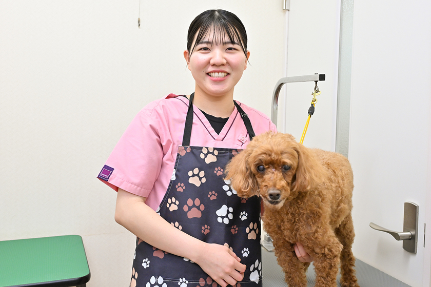 高校生の頃はトリマーの仕事をしたいと考えていました。そこで出会ったのが東北動物看護学院です。ここはトリミングも学べるので「動物看護の資格をあわせて取得しても損はないかな?」と思い進学しました。授業では看護の知識をメインにしつつ、ケアシャンプーなど基本的な技術を学びます。そのためカット技術などを習得したのは放課後の強化コースです。結果的には愛玩動物看護師とトリマーの資格を両方取得でき、血液検査など各種検査にも詳しいトリマーになることができました。そのことにより業務のなかでも、会計の際に飼い主さんへ皮膚のケアや病気の見分け方を伝えたりする、ちょっとしたプラスの接客が喜んでもらえています。