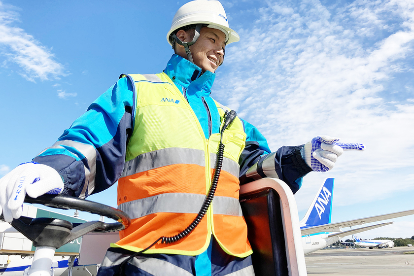 空港地上支援業務の機側作業責任者として、航空機の到着から出発までの安全監視や工程管理業務を行っております。航空機への手荷物や貨物の搭降載業務は、時間も気にしながら作業しなければなりません。一つのミスが航空機やお客さまの安全に関わるため、同僚や関係者間のコミュニケーションがとても大切になってきます。普段から先輩後輩関係なく、気軽に話す事が出来る雰囲気を作り、他部署の方々とも交流を持つよう意識しています。出発時に“グッバイウェーブ”と呼ばれるお見送りをした際、お客様から手を振り返して頂けると、安全にそして定時に出発させる事が出来た達成感と共に疲れも吹き飛んでしまうぐらい、やりがいを感じます。