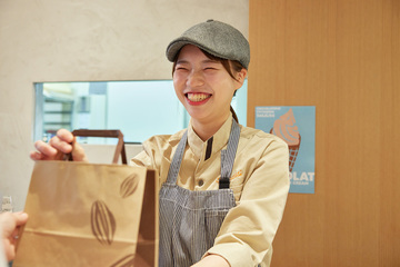今の職場で働きたいと思ったのは、学生時代、学校の授業にこのお店のパティシエが外部講師として来られ、指導していただいたのがきっかけです。その時につくって食べたチョコブラウニーケーキが今まで食べたことがないくらい美味しくて、「こんなケーキを私もつくりたい!」と感動しました。食感も素晴らしく、チョコレートの風味も強くて、大袈裟かもしれませんが人生で初めて味わった美味しさという感じで、本当に衝撃でしたね。そこから就職活動を頑張って入社させていただきました。憧れのお店で働けていることに加え、焼き菓子担当として夢だったチョコブラウニーケーキもつくれているなど、本当に毎日が充実しています。