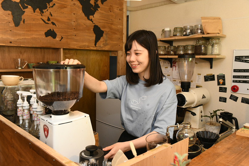 MOSHIMOSHI COFFEEオーナー・バリスタ/カフェ総合マネジメントコース/学校卒業後は、カフェを全国に展開する企業でバリスタとしての技術と接客技術を磨いた下野さん。現在は、東京で自分のお店「MOSHIMOSHI COFFEE」をオープン。「おいしいコーヒー×〇〇」をコンセプトに、地域の人とのさまざまなコラボを実践し、人と人のつながり、地域とのつながりの輪を広げている。