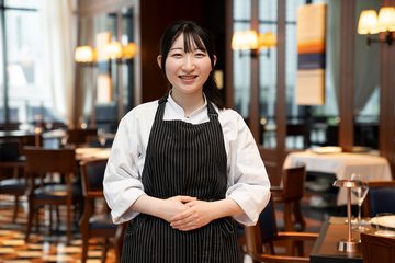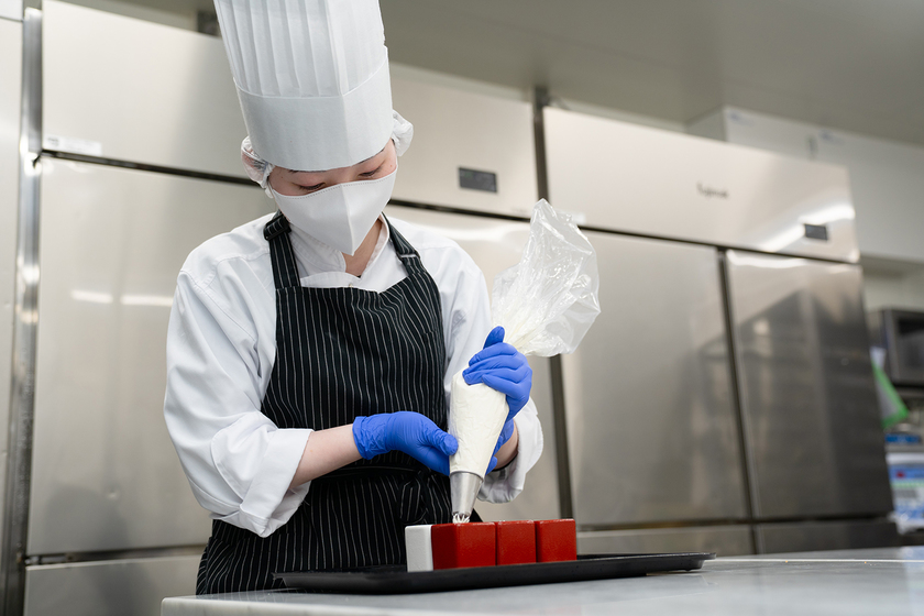 ビュッフェやアフタヌーンティーが大好きで「あんなにかわいくて、おいしいケーキが作りたい」と思っていました。その願いが叶い、現在はスイーツビュッフェが人気の「ヒルトン横浜」で働いています。ランチ、ディナーのデザートづくりや午後3時からはじまるスイーツビュッフェの準備など、忙しさの中にも好きなことを仕事にできた充実感を味わう毎日です。お客様の前で作る生絞りモンブランを担当させていただいているため、感想を耳にする機会もあり「おいしかった!」の一言でどんなに勇気づけられるかを実感する日々です。これからも成長を続け、多くの方の思い出に残るかわいくて、おいしいケーキを作っていきたいと改めて思っています。