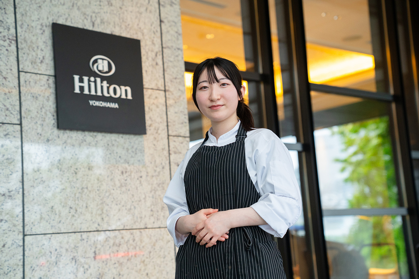 ビュッフェやアフタヌーンティーが大好きで「あんなにかわいくて、おいしいケーキが作りたい」と思っていました。その願いが叶い、現在はスイーツビュッフェが人気の「ヒルトン横浜」で働いています。ランチ、ディナーのデザートづくりや午後3時からはじまるスイーツビュッフェの準備など、忙しさの中にも好きなことを仕事にできた充実感を味わう毎日です。お客様の前で作る生絞りモンブランを担当させていただいているため、感想を耳にする機会もあり「おいしかった!」の一言でどんなに勇気づけられるかを実感する日々です。これからも成長を続け、多くの方の思い出に残るかわいくて、おいしいケーキを作っていきたいと改めて思っています。