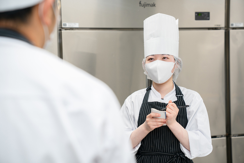 机にじっと座っているより、体を動かしながら覚えていく方が得意な私にとって、毎日、調理実習が繰り返される2年間は刺激と学びに満ちたものでした。特に1年次から行われる「メニュー考案」は印象的で班ごとに話し合ってレシピを決め、何度か試作をして味比べをするというプロセスを通して多くの気づきを得ることができたと思います。また、自分たちが考案したケーキを学内にあるパティスリーで一般のお客様に販売したり、地域の行政・教育機関・生産農家とのコラボで手づくりしたボンボンショコラを有名な百貨店で販売するという貴重な経験を通して、「現場で求められるスキルとは何か」を身にしみて感じ取ることができました。