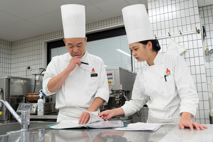 豊富な実習が特長の一つだというYAMANOTE。実はそこで使う食材の良さにも注目してほしいと山浦先生は語る。学生が使う実習のチョコレートは、プロが聞けば驚くほどのグレード。また生クリームやバターなどについても、代替品を極力排して指導しているという。「製菓や調理のプロを目指す人は、“いろいろな料理や食材を食べて、舌に味を覚えさせろ”とよく言われます」と山浦先生。そうして得た味の記憶が、つくり手としての土台になる。「本物志向の食材でつくり、食べるという経験は、プロになった時の大きな財産になります」。
