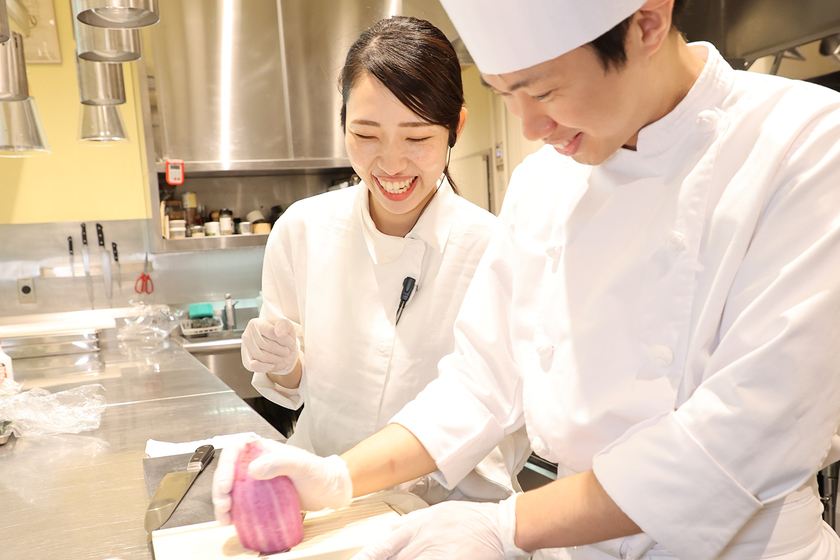 結婚式場のキュイジニエとして、特別な日を彩る婚礼料理を手掛けるのが私の仕事です。平日は野菜のカットや肉・魚介類の下処理、ソースやピューレの仕込みを行い、結婚式本番を迎える土日は、披露宴の進行に合わせながら最終仕上げをします。また、ビュッフェがある場合は参列者の前に出て取り分けも行います。婚礼を大きなトラブルなく終えられたときには大きな達成感を感じますし、ビュッフェでお客様が料理やデザートを楽しそうに選び、美味しそうに召し上がっている姿を間近で見られることも、この仕事ならではのやりがいです。料理を通して、お客様の幸せな一日に関われることが、キュイジニエという仕事の一番の魅力だと感じています。