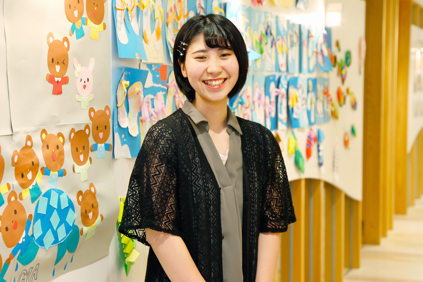 通いやすさや先生・先輩たちの優しく明るい雰囲気、3年間で保育士と幼稚園教諭の資格を取得できることと、校舎に認可保育園が併設されていて、園児と関わりながら実践的に学べる点が魅力的。グループワークや発表の時間が多い授業スタイルにも惹かれました。