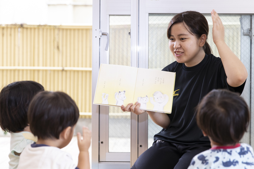 私が勤務している勢理客保育園は、50年の歴史がある地域に根差した保育園です。0歳から5歳まで、150名のこども達をお預かりし、約30名の保育士でこども達のお世話、成長サポートを行っています。小さい頃から憧れていた仕事なので、やりがいは大きいのですが、実際に保育の現場に出てみると、わからないこともたくさん。知識不足を痛感することも多々あり、そのつど先輩たちに助けてもらいながら、日々こども達と向き合っています。これからの目標は、保育士としての成長。保育士資格を持つことはゴールではなくスタートです。現場で学ぶことは本当に無限大ですから、学び続けることが大切だと思っています。