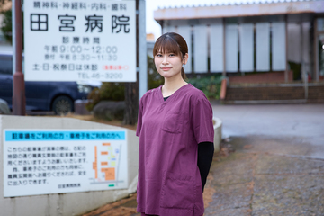 田宮病院の精神科救急入院病棟(スーパー救急)で看護師をしています。症状が激しい患者様が多く、過酷な現場です。ですがその分、最初は拒絶されていた患者様でも、毎日関わり続けることで少しずつ信頼関係を築けたり、症状が落ち着いて会話ができるようになり「一番辛い時にそばにいてくれて嬉しかった」と感謝の言葉をいただけると、とても嬉しいです。特に鬱病の患者様から、「話を聞いてくれただけで救われた」と言われる瞬間は、本当にこの仕事をやっていて良かったと感じます。元気になって退院していく姿を見送る時には大変さを超えた深いやりがいを実感します。こころと身体の両方に寄り添える、かけがえのない仕事です。