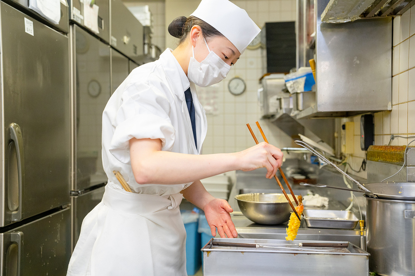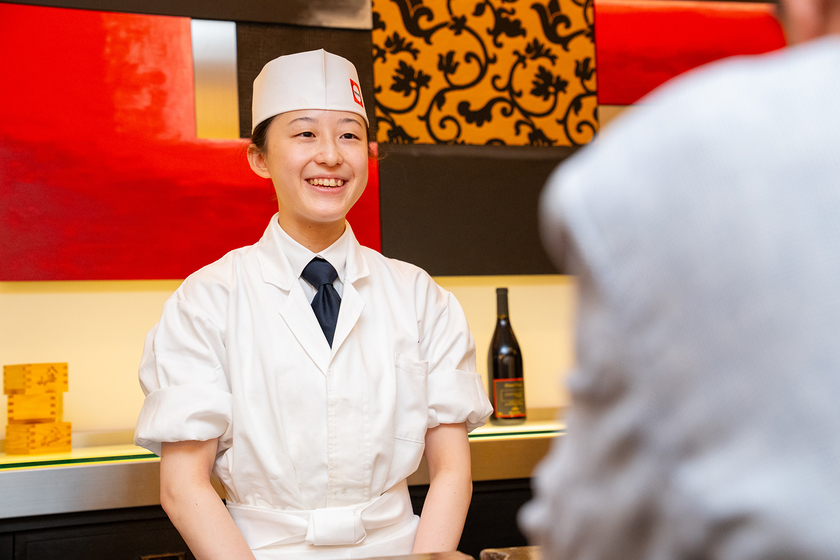 私は「ホテルニューオータニ(東京)」内の直営店「麺処 NAKAJIMA」で、主に天ぷら・だし巻き卵などの調理や前菜・デザートの盛り付けを担当しています。特に心掛けているのは料理に対する第一印象を大切にすること。お客様が目の前に座るカウンター席で盛り付けをする機会もあるのですが、会話しながらも頭の中では「このデザートの魅力を目でも味わってほしい」と思いながら手を動かしています。そういう席で「おいしかった」「また食べに来たい」と言っていただくことが最大の喜び。リピーターの中には「Sさんが焼いた“だし巻き卵”を」とオーダーされるお客様もいらっしゃいます。そんな時は、もちろん「天にも昇る気持ち」です!