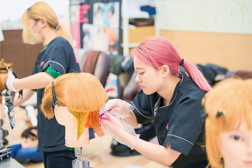 フリーデザインカットの授業を受けられる本科は、ヘアメイクアップアーティストを目指す学科で、メイクに特化したオリジナルカリキュラムで学びつつ、美容師の国家資格の取得を目指します。また「美容科」はヘアスタイリストコースのほか、ネイル&アイラッシュコースがあり、身につけたいプラスαの技術を磨くことができます。
