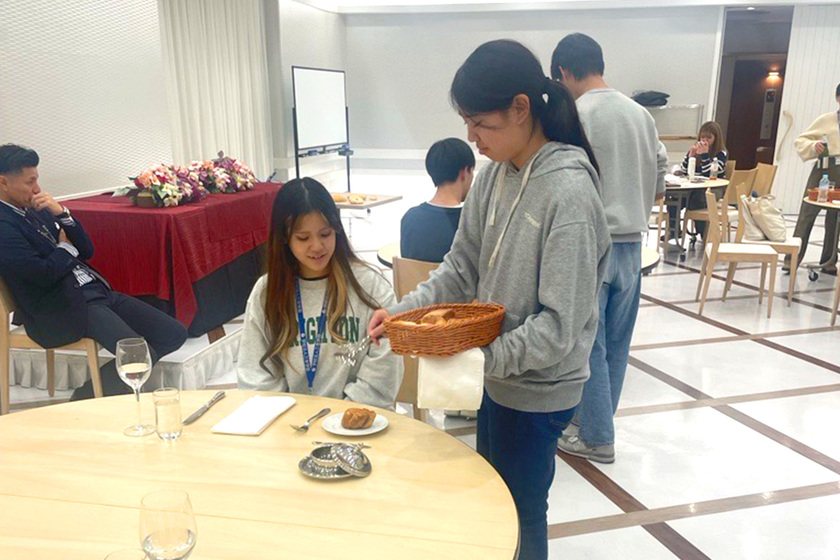 授業では、ホテルレストランさながらの設備を使い、実際の現場に近い環境でサービススキルを磨きます。まず、立ち方・歩き方・所作などの基本動作を習得し、次にオーダーの取り方、料理やドリンクの提供、ワインの注ぎ方などの実技を段階的に練習します。ロールプレイ形式で接客の流れを体験し、状況に応じた対応力も身につけます。学内にはバンケットルームがあり、リアルに接客の流れを体験することができます。