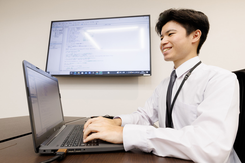 株式会社トライサーブ勤務/AIプログラミング&CGクリエイター科 AIプログラミングコース/2023年卒/人が集まって作業をすれば、何かしら問題は起きるもの。そんな時には、専門学校時代に身につけた「情報共有」の習慣がモノを言うと語る西村さん。「チームで作業する仕事なので、情報共有や報・連・相は欠かせません。エラー対処だったり進捗遅れなど、問題の原因を探って、対応を考え、行動に移していった経験がこれからも役立つと考えています」。今後はさまざまなシステムの開発に携わって、上流工程の仕事に挑戦したいと意欲を見せる。「そのためにも資格を取ったり、知識や技術力を蓄積して、少しずつレベルアップしていきたいです」