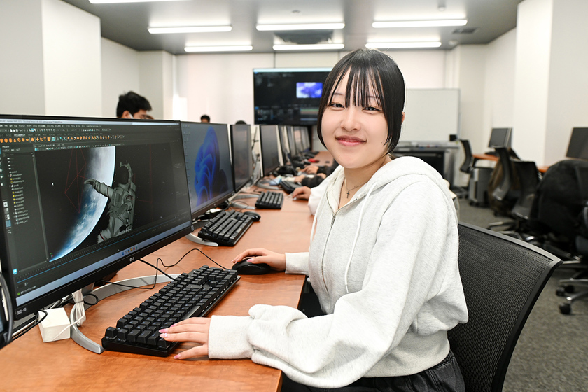 好きな授業は「CGアニメーション」の授業です。自分が描いたキャラクターをCGソフトを使って動きをつけるのが、本当に面白くて毎回楽しく学んでいます。放課後は、飲食店でのアルバイトもがんばっています。