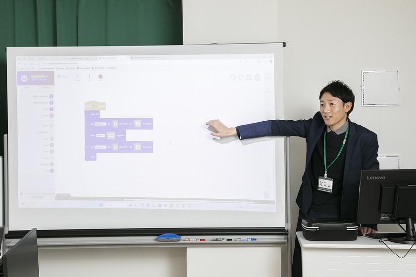 20人程度のクラス編成で授業を展開。実技では4~5人のグループに分かれて実際にドローンを飛ばします。毎回飛行記録を取ることで、全員参加型のゲーム感覚でドローンの特性を学ぶことができます。ドローンは少し向きを変えるだけで左右の感覚がなくなり、上手く飛ばせなくなります。そのため、カリキュラムの前半では操縦技術を習得。その後、後半では飛行ルートをプログラミングする技術を身に着けていきます。大枠のルートは大西先生が設定。最終的には設定ルートを自動運転でクリアできるところまで学びます。