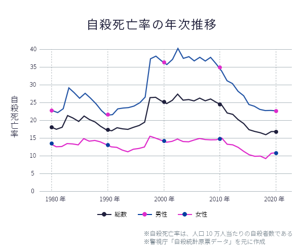「課題文型」で文章資料を要約するのと同じく、図表資料があればまずはそこから読み取れることを第1段落でまとめる。図表でも“対比”が重要。さらに意識したいのが、「○○年の男性自殺率は20.0だ」などの〝数値読み上げレベルの点の指摘〟にとどめないこと。上昇・下降傾向に注目して〝線の指摘〟を目指したい。今回なら90年代中ごろからの上昇傾向を指摘できるはず。
