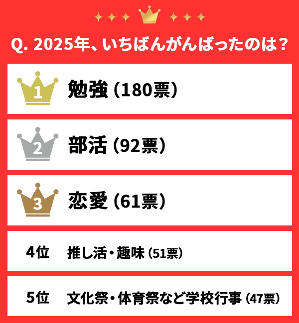 それ以外にも「推し活・趣味」(51票)、「文化祭・体育祭など学校行事」(47票)、「自分磨き」(37票)など。