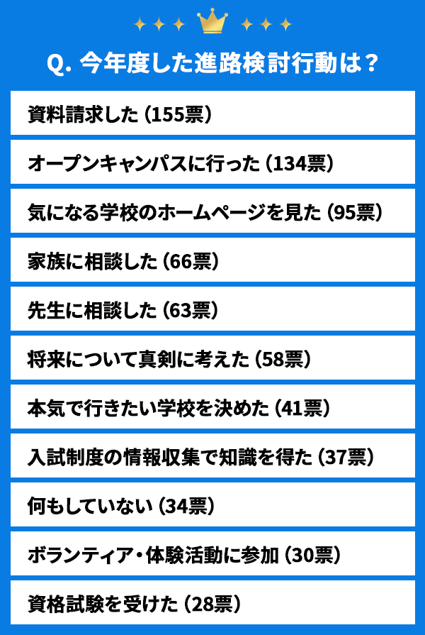 「資料請求した」(155票)と最も多く、「オープンキャンパスに行った」人も134票という結果に!