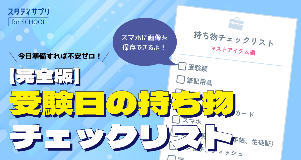 この記事を参考に持ち物を準備すれば、きっと漠然とした不安をぐっとやわらげることができるはず。忘れ物の不安がなくなれば、「あとは試験に集中するだけ」という気持ちにしぜんと切り替わっていくよ!「家に帰るまでが遠足」とは逆、「持ち物の準備から試験」だと思ってぜひ前向きな気持ちで取り組んでみて!ここまで勉強してきた自分、受験のために準備してきた自分を信じてあげられれば、きっと本番でも実力が発揮できるはずだよ!