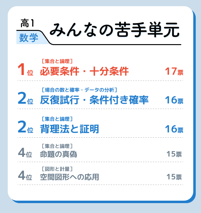 数学では、1〜5位以内に「集合と論理」の単元から、3つがランクイン。また、表には乗らなかったけど、10位以内には「2次関数」、「図形と計量」から三角比に関連する単元もいくつか入っていた。