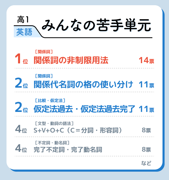 英語のアンケートでは、とくに「関係詞」に関する単元が10位以内に多く上がっていたよ!