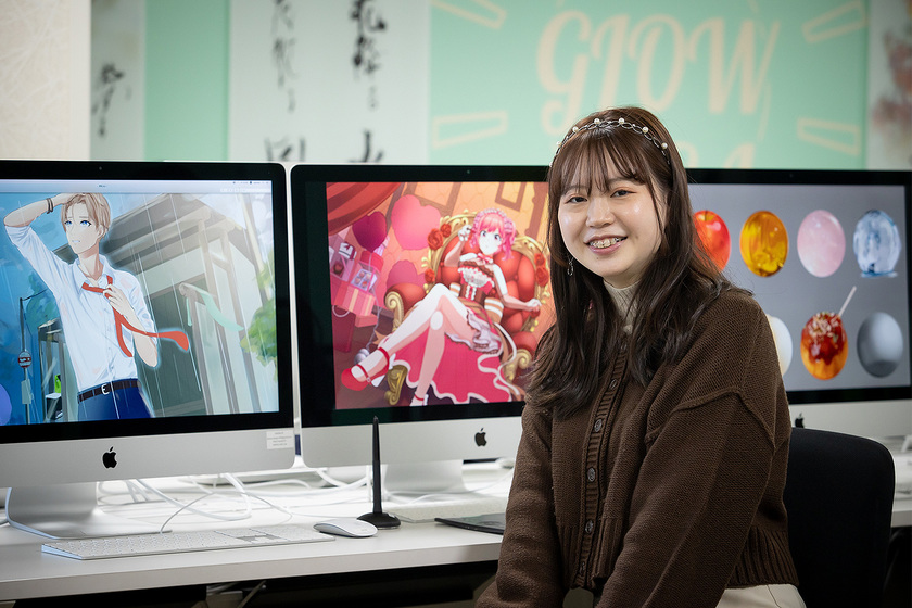 創作ができる授業が好きです。自分の好きなように描けるので、楽な気持ちで楽しく描けます。空き時間は、好きなゲームをやったりtwitterのバズっているイラストを見たりして、情報収集しています。