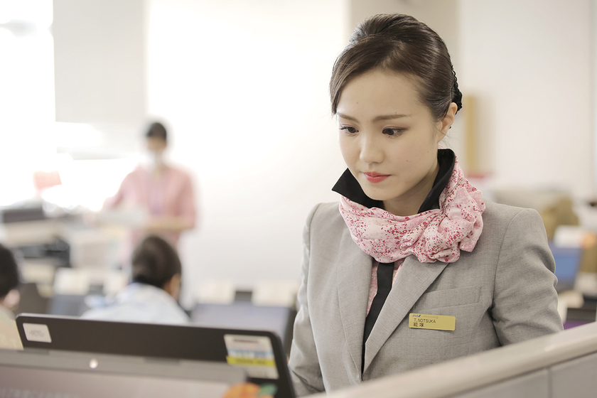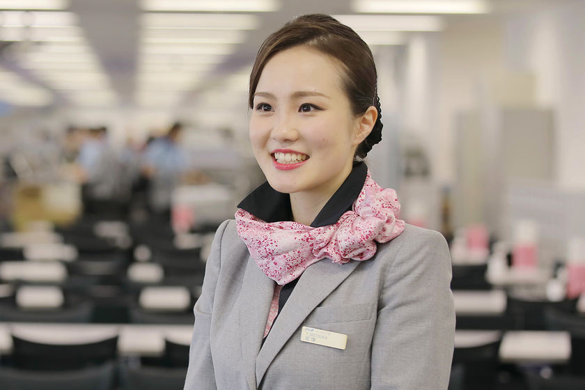 現在は主に国内線の客室乗務員として勤務しています。国際線においては、エコノミークラスとビジネスクラスを担当しています。業務は出社後、パソコンでフライトについての連絡事項をチェックするところからスタート。サービスのコーディネートプランや路線、税関についての注意点などを確認します。その後はクルー全員でのブリーフィング(会議)、保安業務、機内サービスの準備を行い、お客様の搭乗サポートとなります。仕事にやりがいを感じるのは、到着後にお客様から「ありがとう」と言われる時です。私の手を握って「また乗るわ」と言ってくださる方もおられ、もっと頑張ろうという気持ちになります。