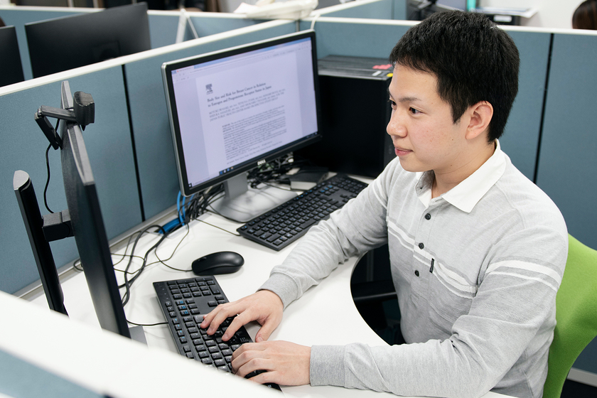 私は、国立がん研究センター がん対策研究所の疫学研究部で研究をしています。疫学は人間集団における健康状態とそれに関連する要因の頻度と分布を明らかにすることで、それらの因果関係を推定していく学問です(例えば、喫煙と肺がんの関係など)。私の研究のひとつは、身長・肥満などの体格や身体活動などの生活習慣と大腸がんの関係。これらについては世界中で多くの研究が行われていますが、私は同じ大腸がんでも様々な顔つき(がんの表面に現れるタンパク質)があることに着目し、研究を進めています。参考にできる先行研究がほとんどないため難しさもありますが、誰も見たことがない世界に初めて触れられる可能性にワクワクしています。