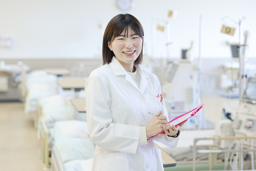 医療法人偕行会勤務/健康科学部 栄養科学科(管理栄養士養成課程) 卒/2021年卒/病院、クリニック、介護施設などを運営する医療法人偕行会の管理栄養士。人工透析患者の採血データや体重を見ながら食事や水分管理の指導を行う。グループ全体の人工透析患者は3000人以上。「責任をもち、たくさんの命を預かっていることや積極的に学会活動に取り組んでいることがこの職場を選んだ理由です」と話す。将来の目標を聞くと、「患者様により確実な栄養指導ができるよう、腎臓病病態栄養専門管理栄養士の資格を取得することです。また、学会や勉強会に積極的に参加してさらに学び、患者様がより納得できる医療に貢献したいです」と語ってくれた。