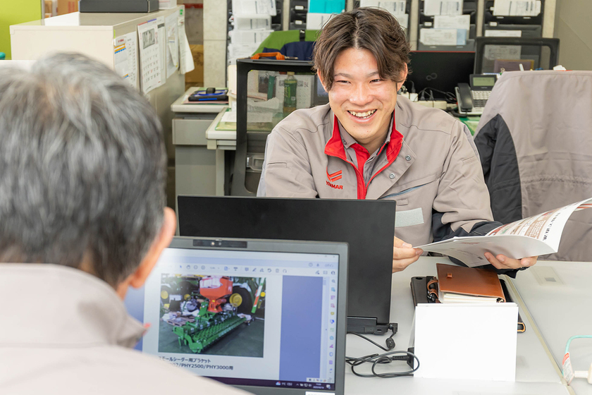 営業職として農家さんが抱えている問題を解決出来るように商品の提案や販売、アフターフォローなどを行っています。入社して最初の4年間は整備士として働いていたこともあり、農家さんからの「この機械のここが調子が悪いんだよね」といった悩みに対して、その場でアドバイスや応急処置などのお手伝いができることは大きな強みです。現在はまだ営業職となって数か月で分からないことも多いのですが、先輩や上司から新たな知識を教えてもらうたびに、常にアップデートされていく実感があります。まだまだ未熟で農家さんの抱えている問題に気付けないこともありますが、信頼関係を築いて悩みを理解し解決に繋げることが目標です。