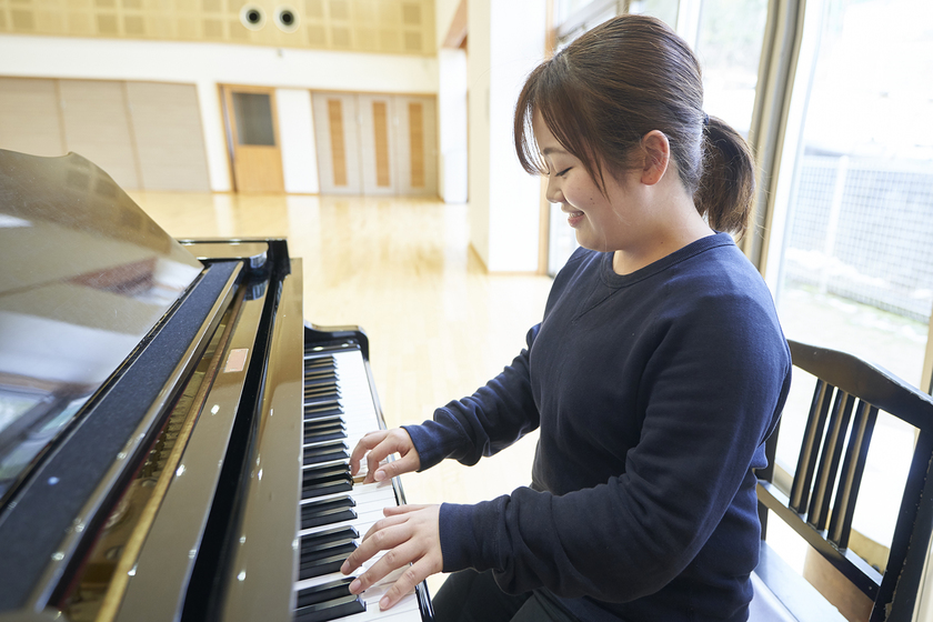 ピアノについては心配いりません。私も短大入学時は全然弾けませんでしたが、先生が個々のレベルに合わせて丁寧に教えてくださったので、卒業時には大勢のこどもの前でも自信を持って弾けるようになりました。初心者はいきなり両手で弾かずに、最初は右手、次は左手と、少しずつ慣れていけばいいと思います。また、大学選びに関して私は、近くに附属園があることを重視しました。保育の現場で働いている人にしか分からないような具体的な疑問について、すぐ聞きに行けるからです。そうして実際に先生になったら、こどもの目線で話すことを心がけてください。分かりやすい言葉で、ゆっくりと、優しい気持ちで話す。きっと心が通じるはずです。