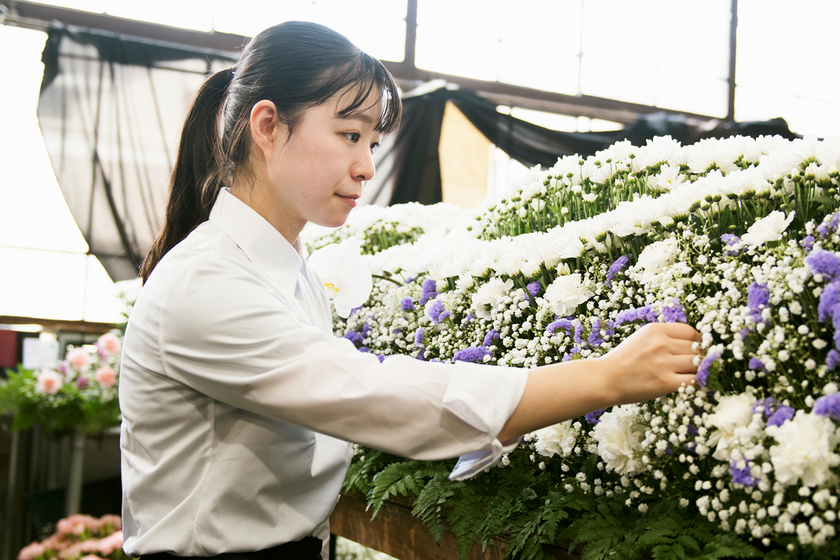 葬儀に欠かせない生花祭壇の制作を担当しています。入社1年目は、花の持ちをよくするために欠かせない「水あげ」という作業や、先輩たちのサポートをしながら仕事の流れを覚え、2年目から制作を任されるようになりました。祭壇の大きさにもよりますが、数名のチームで一つの祭壇を仕上げます。葬儀は突然入るため、寒くなる冬や日によっては時間との戦い。見た目が大切な仕事なので、集中力も欠かせません。けれども、お一人お一人の人生の最期をお花によって彩る仕事には大きなやりがいを感じます。納品のため会場に出向いた際、ご遺族の方からお褒めの言葉をいただくこともあり、その瞬間に本当にこの仕事を選んでよかったと思います。