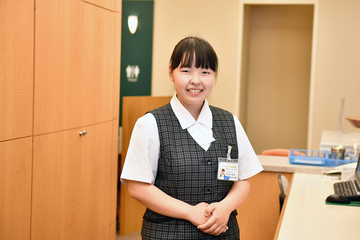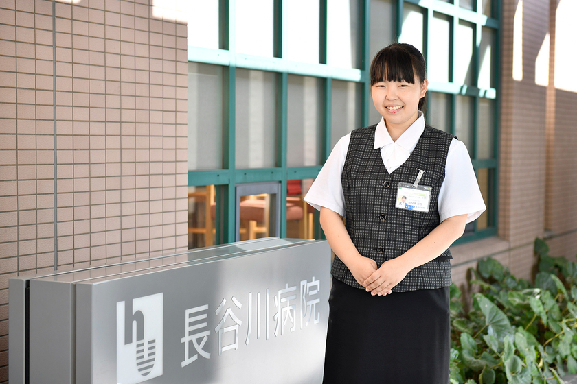 富山市にある長谷川病院で受付として働いています。仕事の内容は、外来の患者様の受付や会計業務、そして電話対応などさまざまです。痛みやつらそうな患者様もいらっしゃるので、常に気配りや目配りを大切にし、お一人お一人に合わせた対応を心掛けています。この仕事をしていてやりがいを感じるのは、患者様から「ありがとう」の言葉をいただけたときです。受付は病院の顔とも言われ、毎日たくさんの患者様と接する大切な仕事ですので、私自身も日々成長して、少しでもお役に立てるよう頑張りたいと思います。